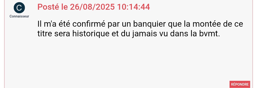 Il m'a été confirmé par un banquier que la montée de ce titre sera historique et du jamais vu dans la bvmt.