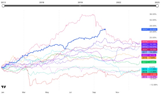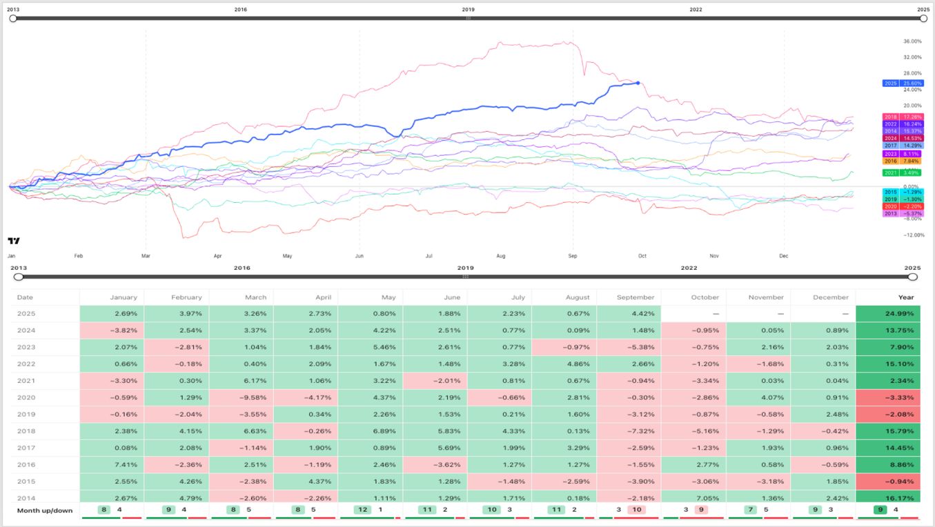 Sur la dernière décennie, l’indice a enregistré en moyenne une performance mensuelle de –1,7 %, avec seulement une seule année en territoire positif (+1,4 %). Cette récurrence statistique suggère que le mois d’octobre est souvent marqué par des prises de bénéfices post-T3, une liquidité réduite et une certaine attentisme des investisseurs avant la clôture annuelle.