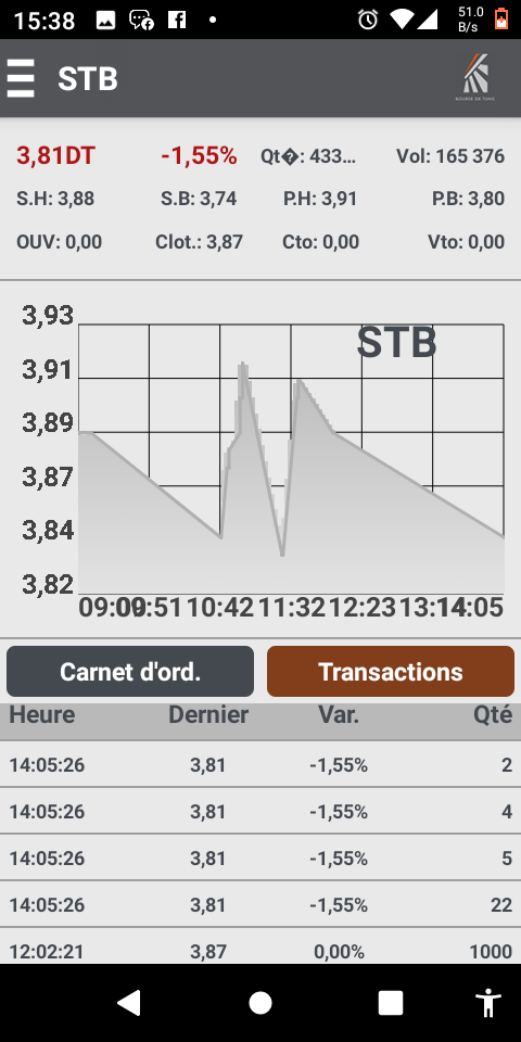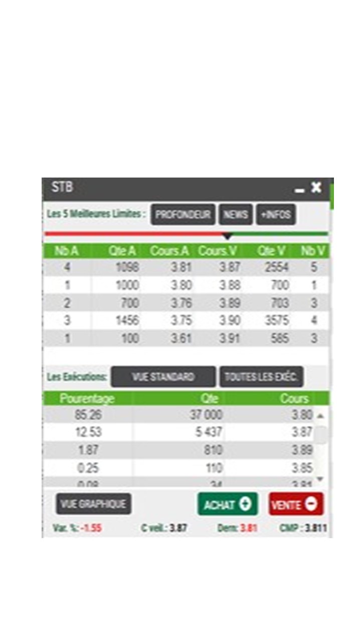 Mais notre STB c'est rezik bilik c'est Étatique a +80% c'est ... Meme 1000 titres dernière transaction a +12h a 3,87dt pour un Anti ou momkon meme un gestionnaire décidé avec 33 titres de la carbonisée a -1,55% a -60millimes a 3,81dt