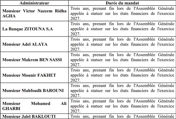 Monsieur Jilani BELLAGHA Trois ans, prenant fin lors de l'Assemblée Générale appelée à statuer sur les états financiers de l'exercice 2027.